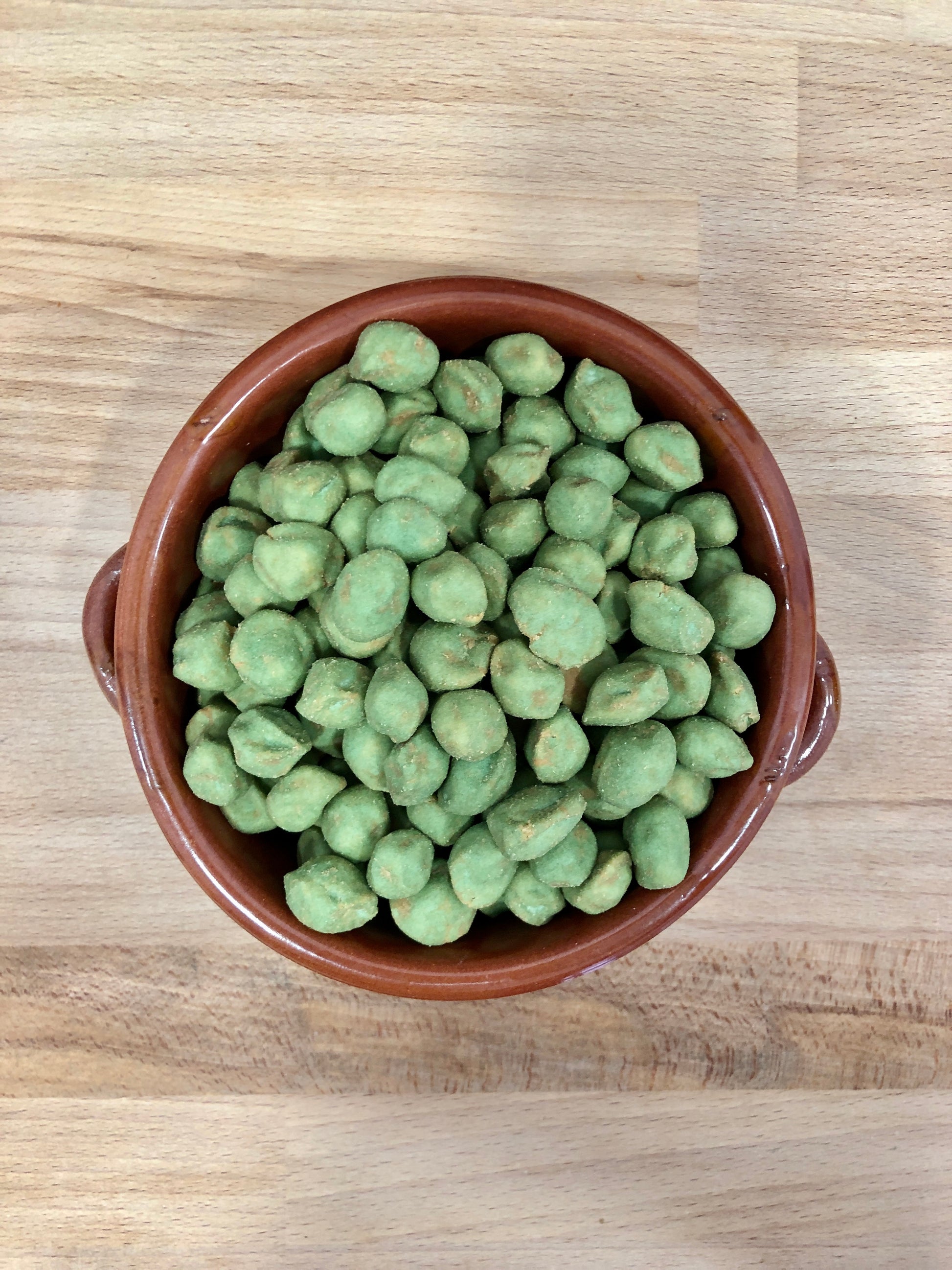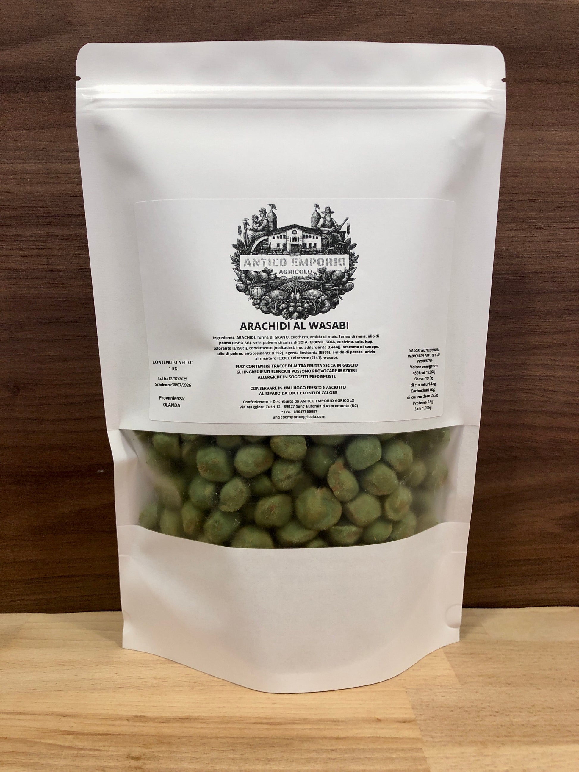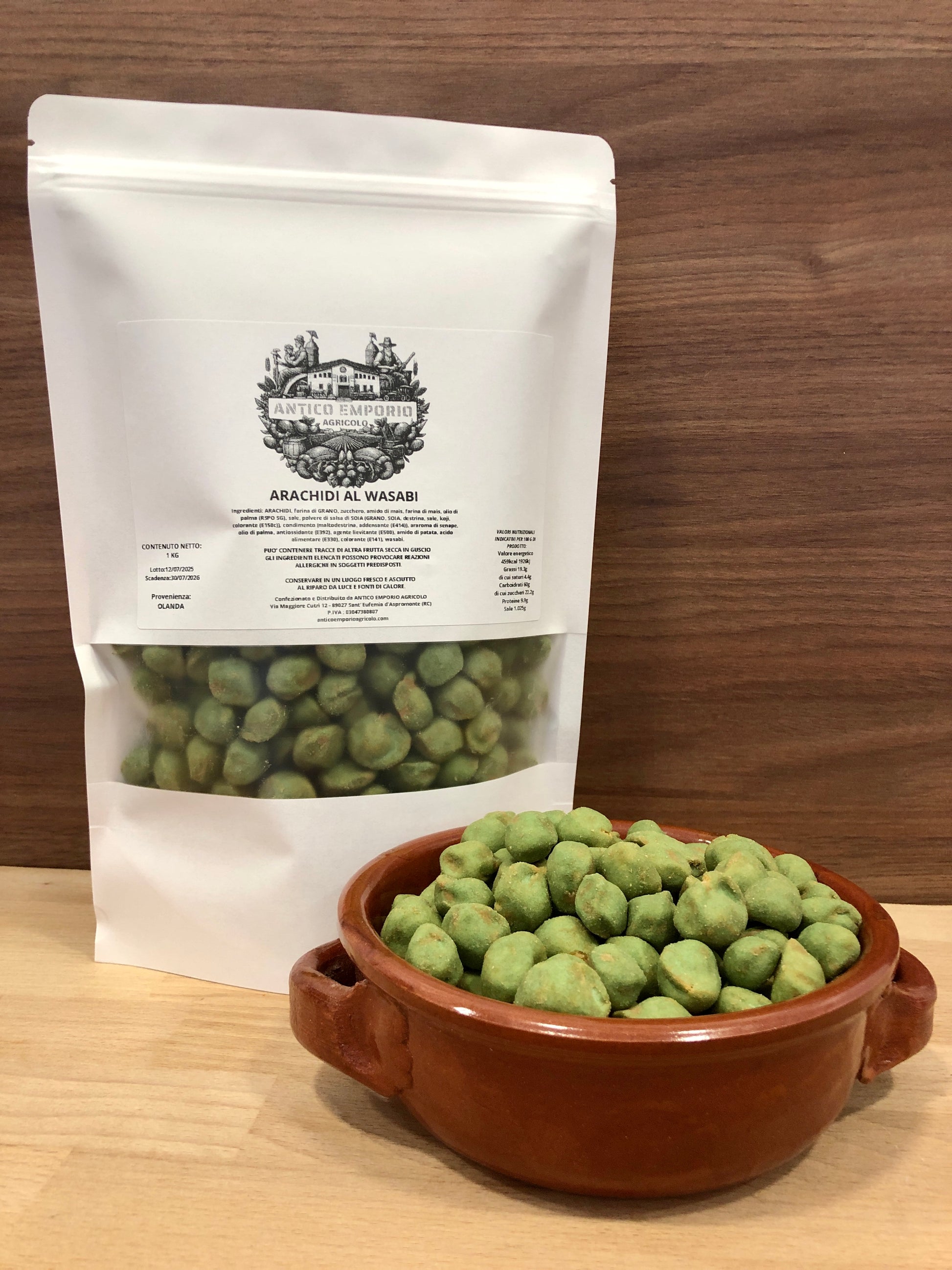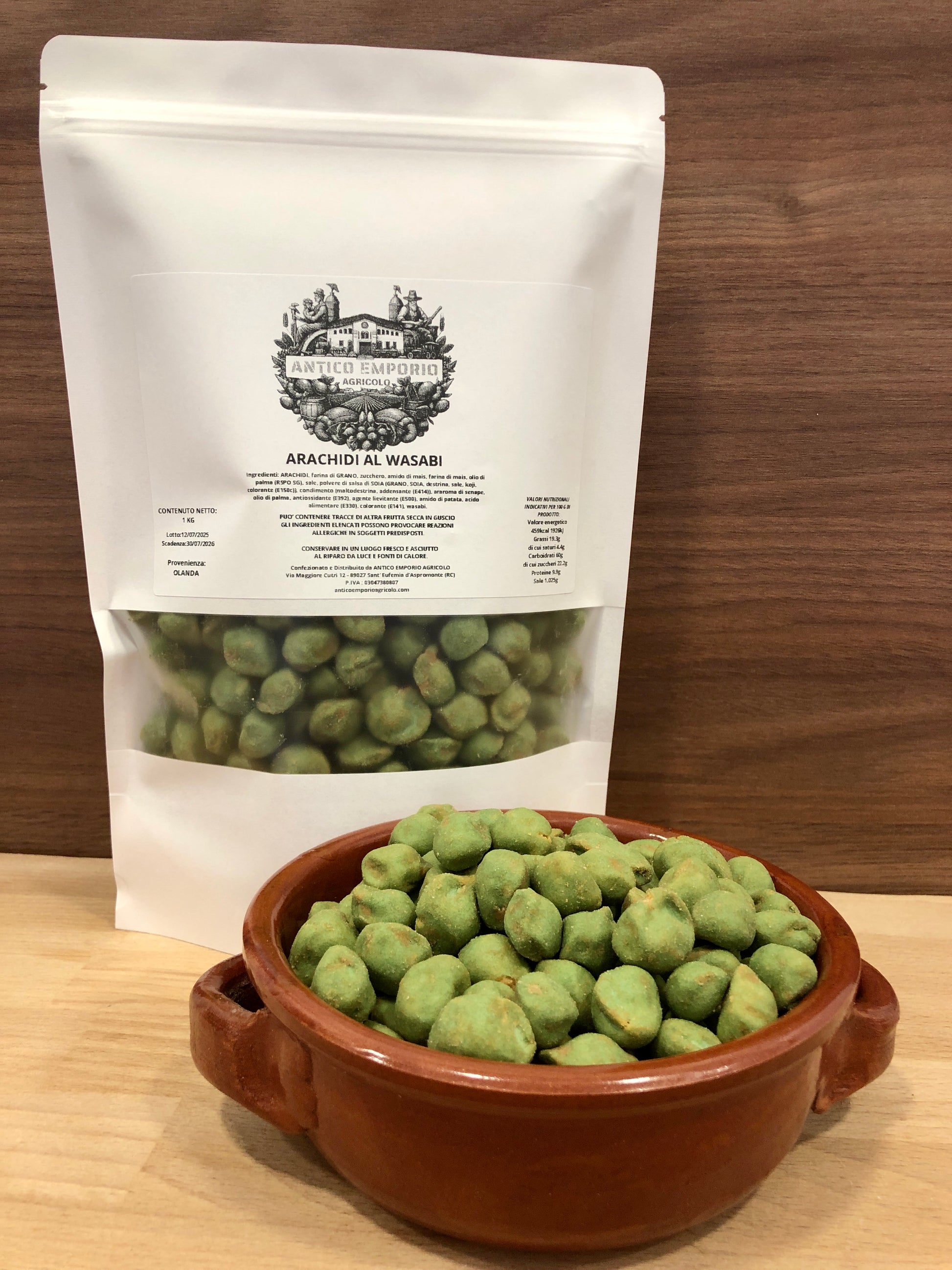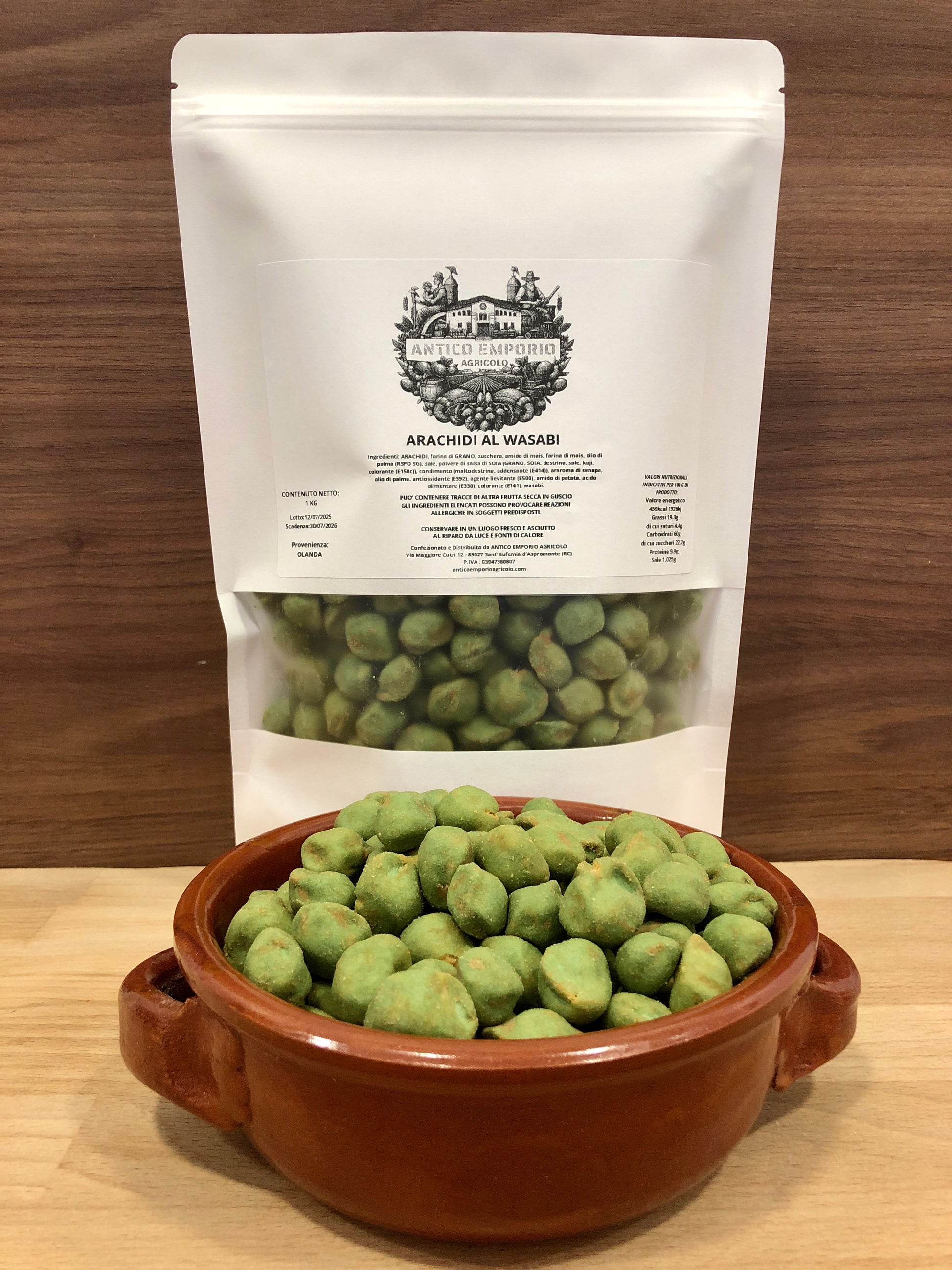 Ingredienti: ARACHIDI, farina di GRANO, zucchero, amido di mais, farina di mais, olio di palma (RSPO SG), sale, polvere di salsa di SOIA (GRANO, SOIA, destrina, sale, koji, colorante (E150c)), condimento (maltodestrina, addensante (E414)), araroma di senape, olio di palma, antiossidante (E392), agente lievitante (E500), amido di patata, acido alimentare (E330), colorante (E141), wasabi.
