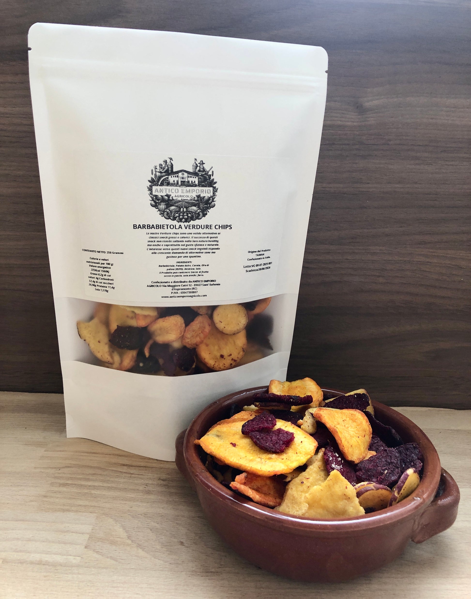 Un mix unico di barbabietola, patata dolce e carota, affettate sottili e trasformate in chips dorate dal sapore autentico e naturale.