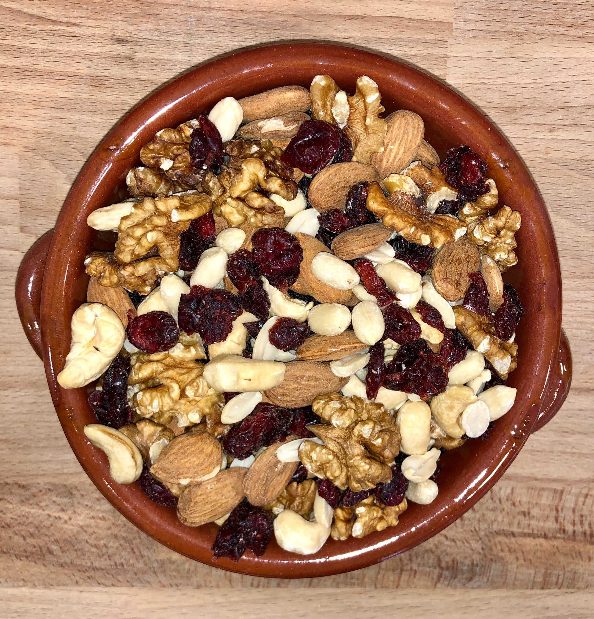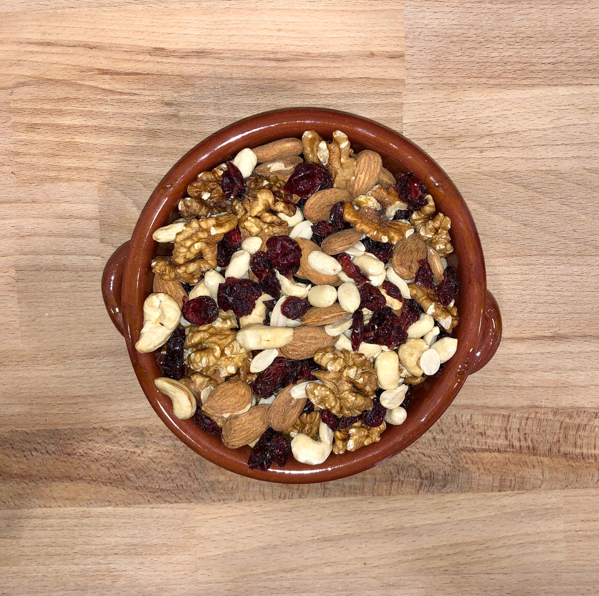 INGREDIENTI: Anacardi Naturali (Vietnam) 20%, Mandorle Sgusciate(Siciliane) 20%, Mirtilli Rossi (USA) 20%, Noci Sgusciate Tipo A (Cile o USA) 20%, Arachidi Crude Pelate (Egitto) 20%. Può contenere tracce di altra frutta secca in guscio e olio di girasole e zucchero di canna presente nei mirtilli.