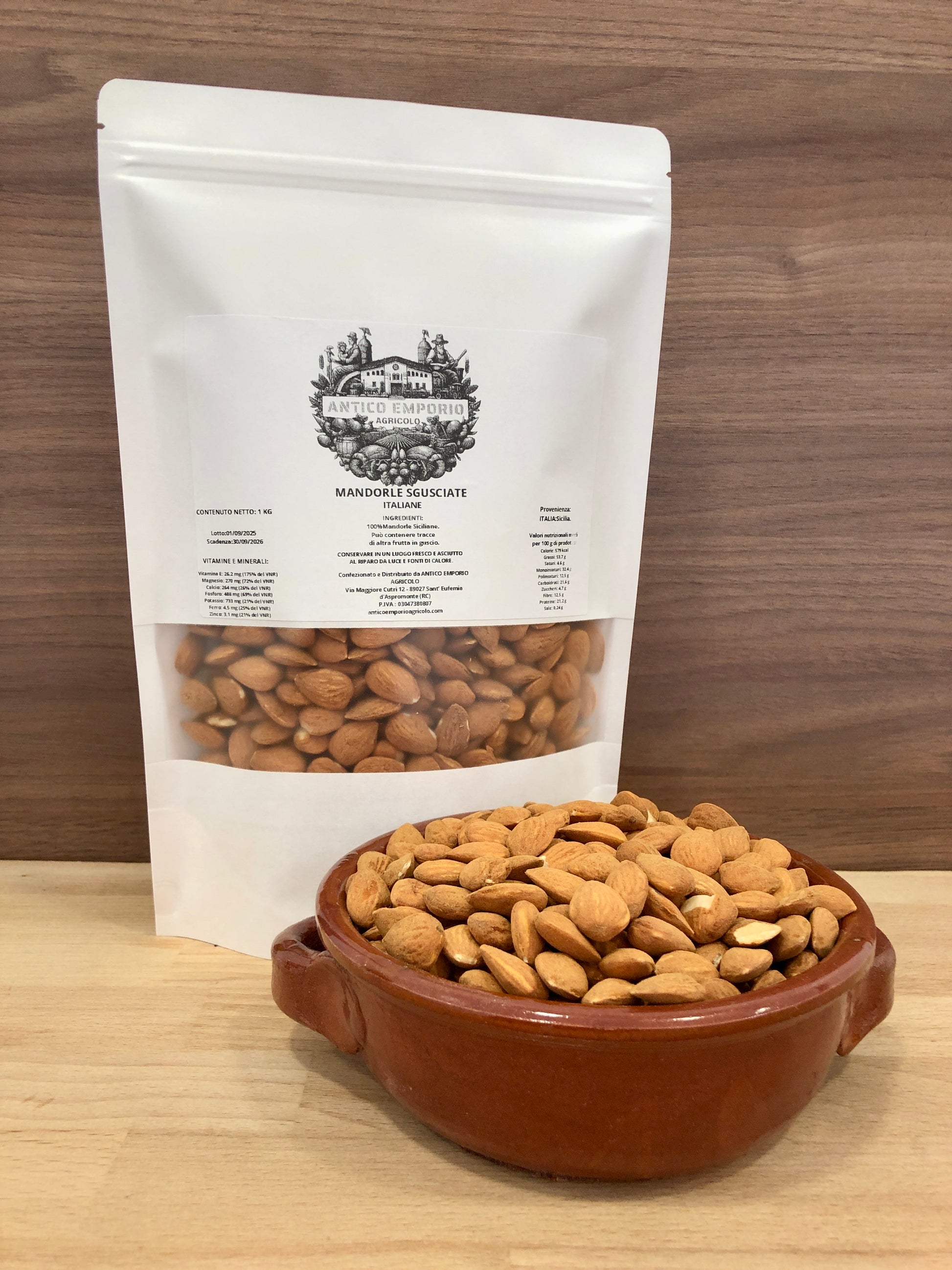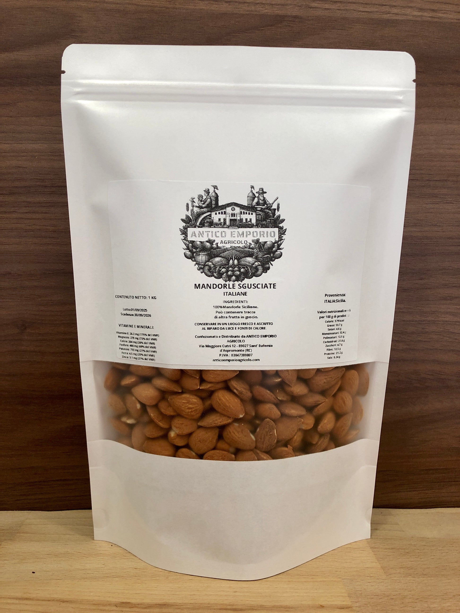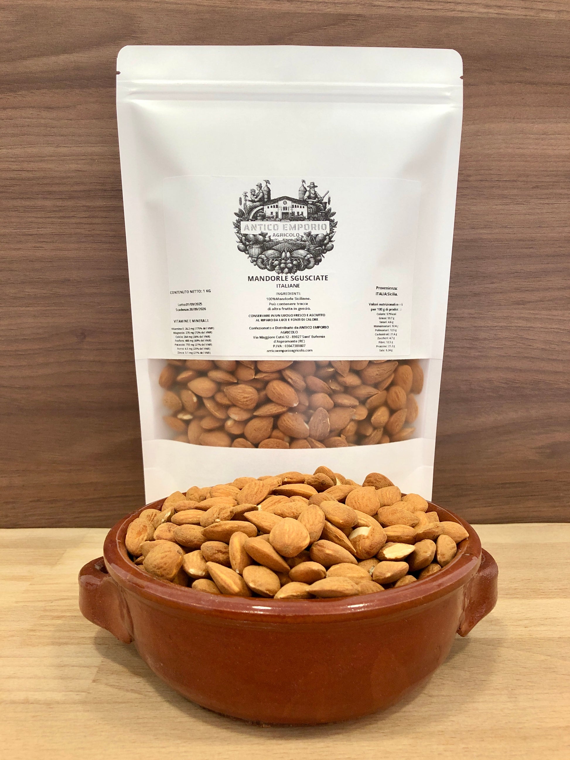 INGREDIENTI: 100% MANDORLE SGUSCIATE SICILIANE CALIBRATE. Può contenere tracce di altra frutta secca in guscio.
