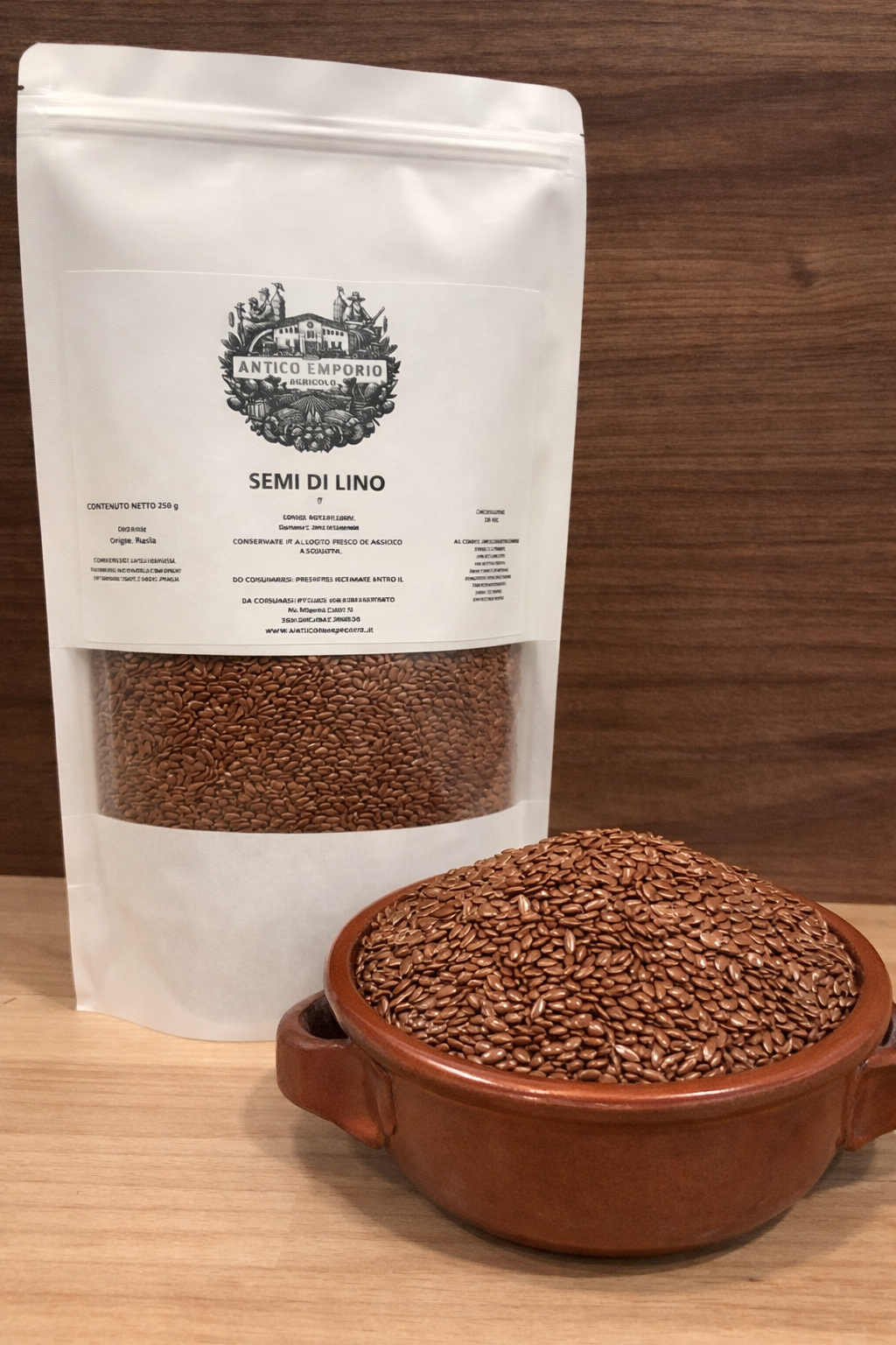 Semi di lino interi selezionati, puliti e confezionati con attenzione per garantire qualità costante e lunga conservazione.